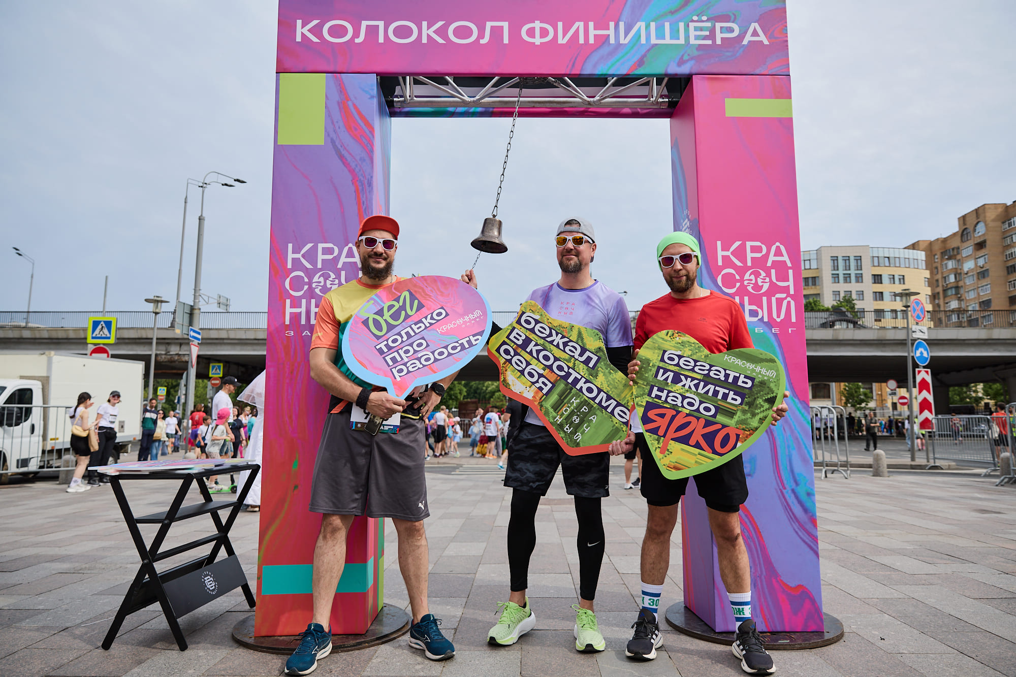 Пожалуйста, не останавливайтесь на линии, продолжайте двигаться дальше. В финишном коридоре вы получите воду и памятный значок.