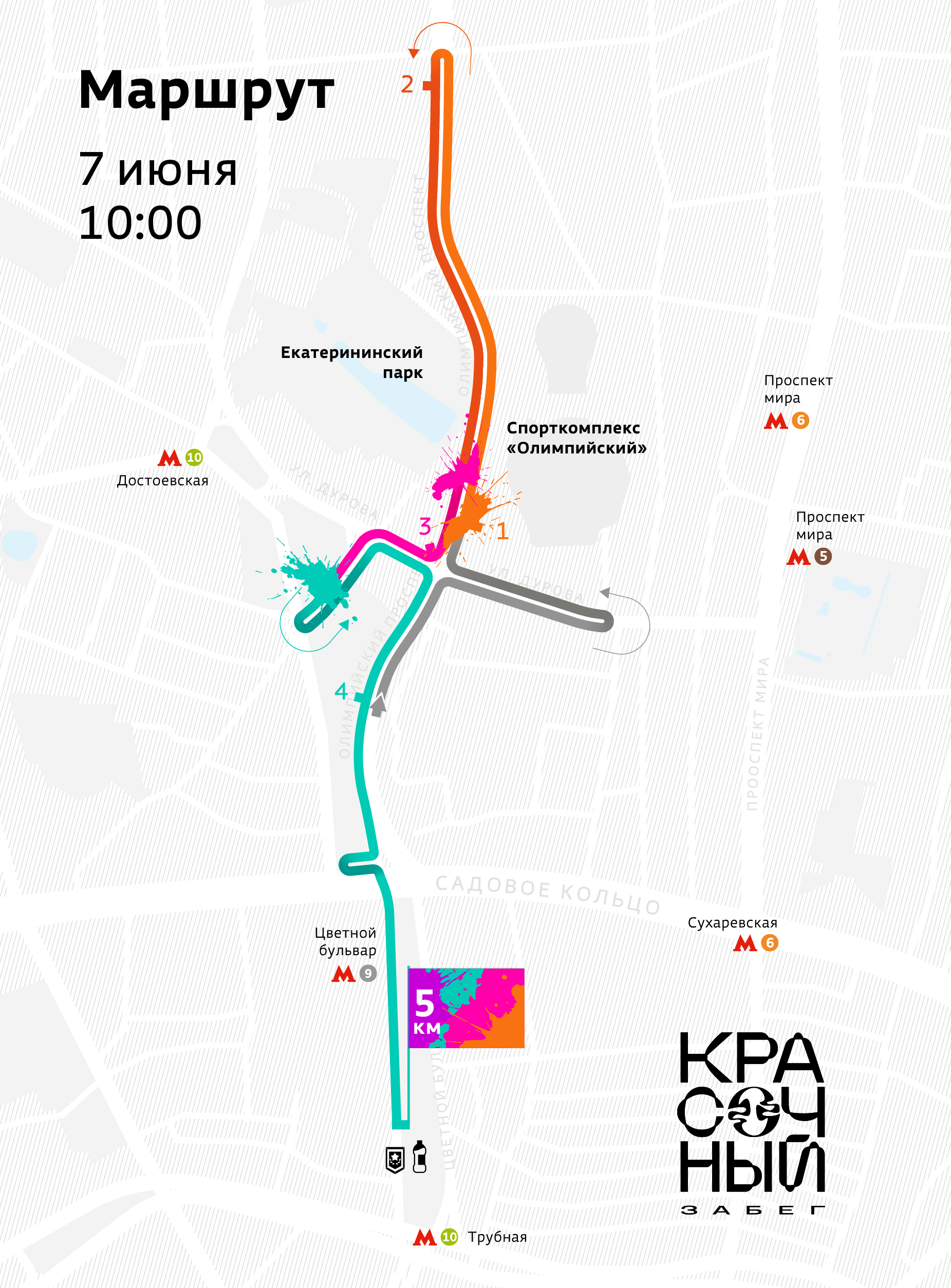 Старт будет расположен недалеко от спортивного комплекса «Олимпийский» на Олимпийском проспекте, а финиш – на Цветном бульваре рядом с Трубной площадью.